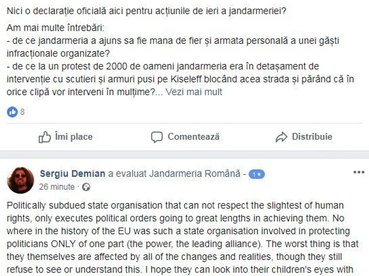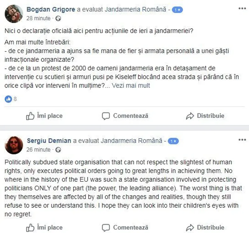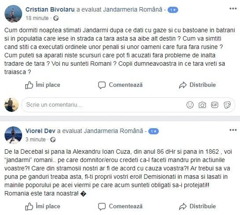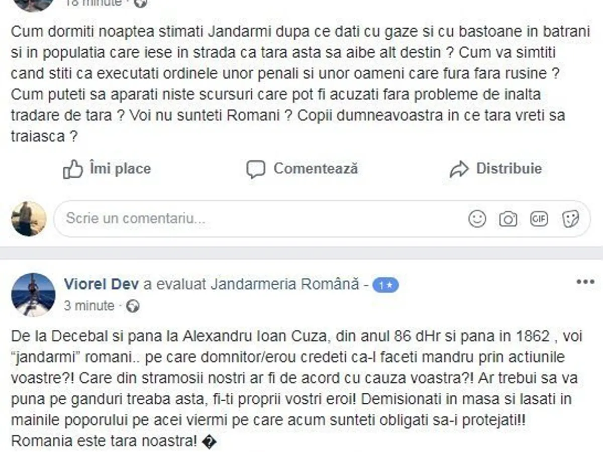 Pe pagina de Facebook a Jandarmeriei Române, oamenii le-au reproșat organelor de forță că sunt plătiți din bani publici pentru a-i apăra, nu pentru a-i lovi și că execute ordinele unor penali.