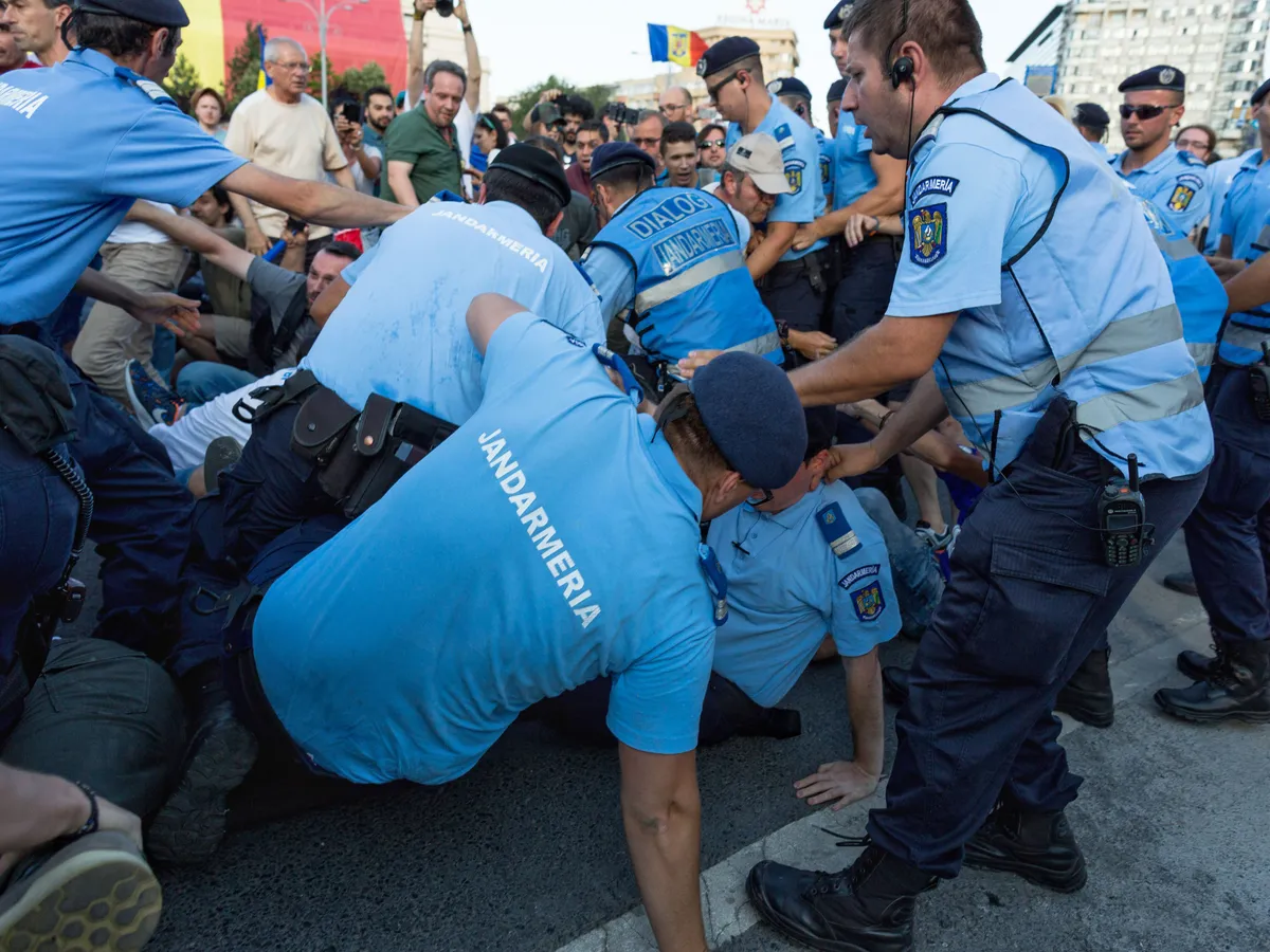 ”Pe de o parte, menționăm că, deși persoana respectivă a susținut că este jurnalist, nu a făcut dovada cu un document oficial care să ateste această calitate. Purtarea, la vedere, a unui badge inscripționat ”PRESS” nu reprezintă un act oficial. Pe de altă parte, reiterăm faptul că, indiferent de calitatea profesională pe care o are orice persoană care participă la acest gen de evenimente publice trebuie să aibă un comportament adecvat și să respecte indicațiile forțelor de ordine care se află în stradă pentru liniștea și siguranța tuturor cetățenilor”, se arată în răspunsul Jandarmeriei Române, trimis Newsweek România. FOTO: Inquam Photos - Octav Ganea