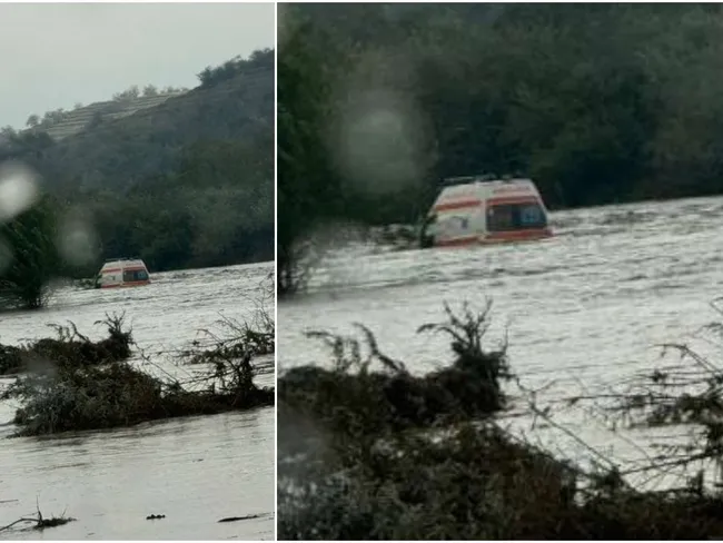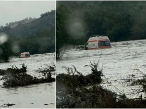 Galați: Echipajul de ambulanță luat cu totul de ape în timpul inundațiilor, salvat de pompierii ISU.
