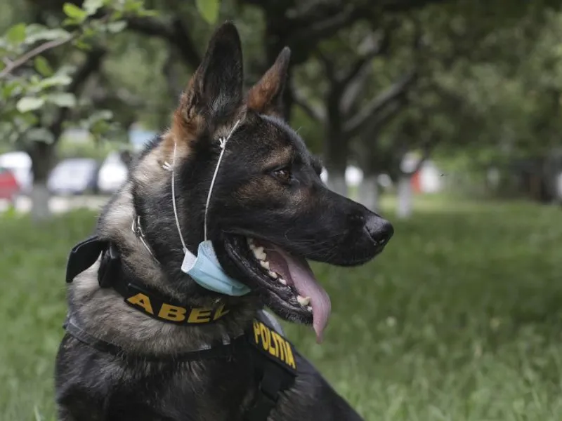 Câinele poliţist Abel, ciobănesc german de 3 ani şi 3 luni, poartă corect mască chirurgicală pentru a înțelege și bipezii cum trebuie să se protezeje pentru a nu se infecta cu Sars-Cov-2.