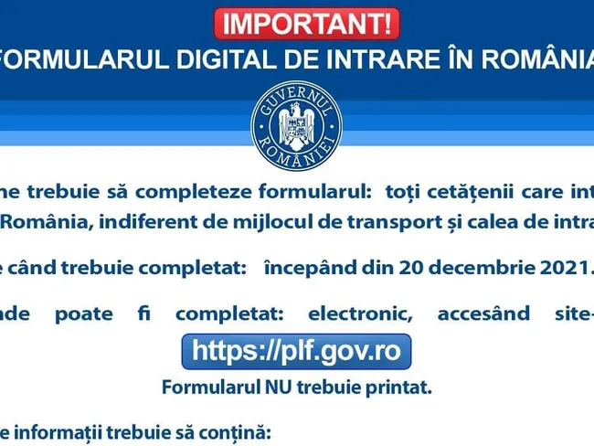 Începând cu 20 decembrie 2021, toate persoanele care sosesc în ţară trebuie să completeze formularul digital de intrare în România (PLF), document adoptat la nivelul a 18 state din Uniunea Europeană şi reglementat de Guvernul României.