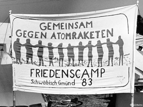 Timp în care SUA și Uniunea Sovietică erau la concurență în cursa înarmărilor, iar mișcarea pacifistă începe să se dezvolte în paralel cu această cultură a protestelor. Motorul sunt de această dată verzii ecologiști, ”Die Grünen”, sindicatele, o parte a SPD și o parte a bisericilor. În noiembrie 1980, reprezentanții acestor grupări publică ”Apelul de la Krefeld”. Cer Republicii Federale să retragă permisiunea staționarii noilor rachete de croazieră americane și a rachetelor Pershing II. Și pentru că ambele state germane ar fi primele afectate de un eventual conflict nuclear, acțiunea de protest, care era îndreptată și împotriva confruntărilor celor două alianțe militare - NATO, respectiv Pactul de la Varșovia – devine cea mai de amploare din întreaga istorie a Republicii Federale. Când în toamna anului 1983, Bundestag-ul vota staționarea acestor rachete conform deciziei NATO ”în două sensuri” - NATO Double Track Decision - (asupra modernizării forțelor nucleare active - inclusiv sisteme Cruise și Pershing II - alături de un control efectiv al armamentului convențional) la patru demonstrații paralele au ieșit pe stradă în Germania Federală aproximativ un milion de oameni în același timp. Oamenii cereau guvernelor asigurarea păcii prin controlul armamentului și dezarmare nucleară. În același timp, RDG a fost singura țară din blocul estic în care se conturase o mișcare pacifistă independentă de stat și de partid.