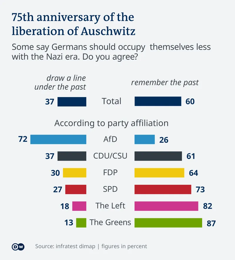 „În general, însă, o majoritate clară este de părere că trecutul ar trebui să ne preocupe în continuare", conchide Roberto Heinrich. Climatul politic şi cel social din Germania s-au schimbat. O demonstrează rezultatele sondajelor "Memo Deutschland" din 2018 şi 2019. Dacă în urmă cu doi ani doar 26% erau pentru încheierea dezbaterii în jurul perioadei naziste, în 2019 procentul acestora crescuse la 33%. Un plus de 4% se constată în urma actualului sondaj infratest dimap, realizat la solicitarea Deutsche Welle.
