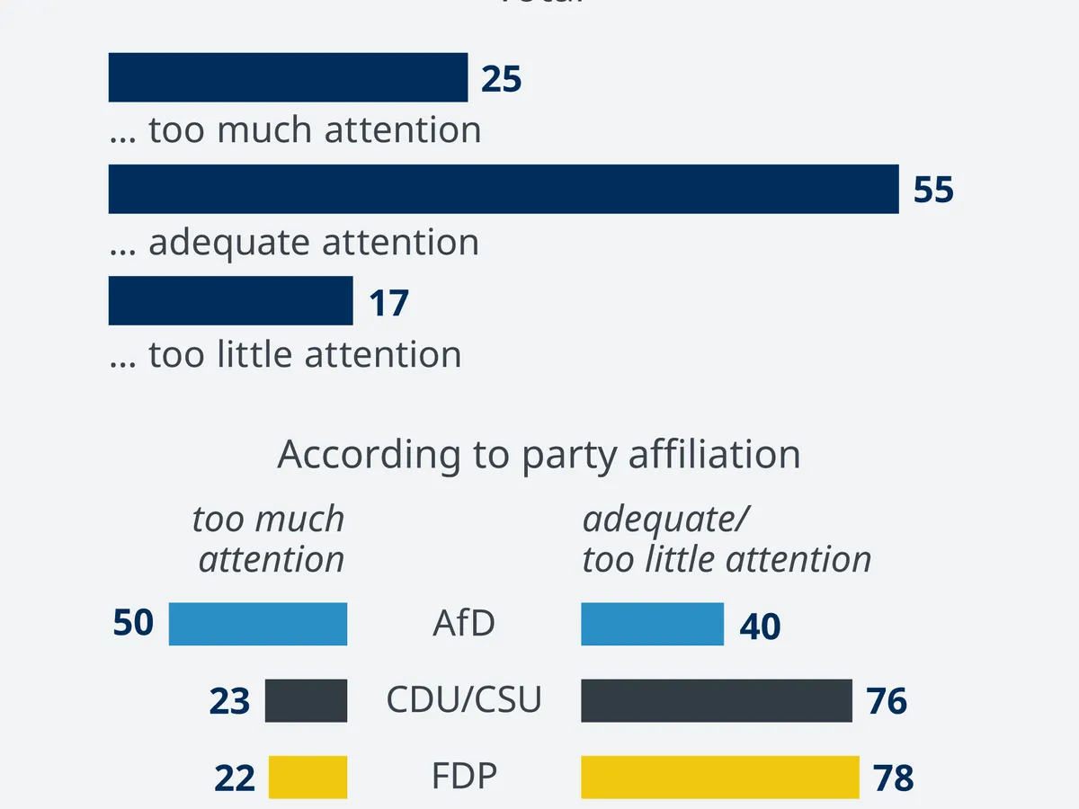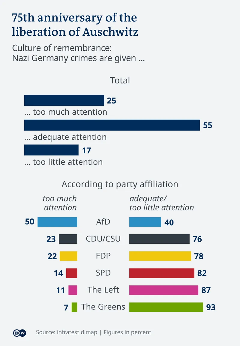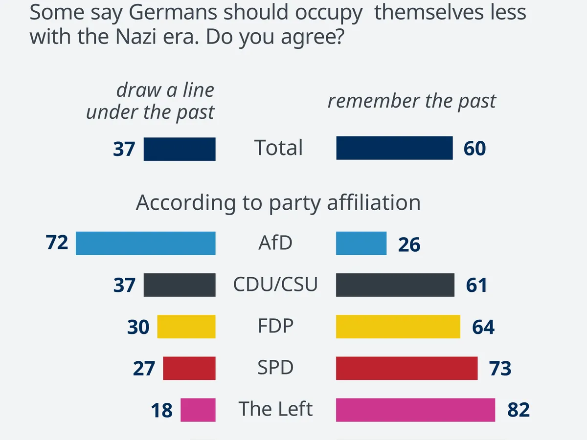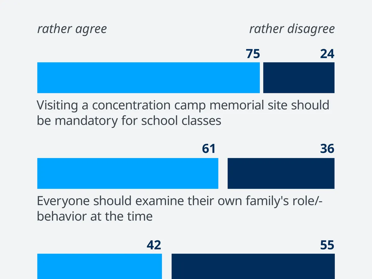 La întrebarea "Considerați că se vorbește prea mult, cu măsură sau prea puțin de crimele regimului nazist?" peste jumătate din germanii chestionați sunt de părere că abordarea trecutului se face într-o manieră potrivită. Fiecare al patrulea german afirmă că se vorbește prea mult despre această perioadă, în vreme ce fiecare al șaselea participant la studiu crede că în Germania se amintește prea puțin de crimele naziste.