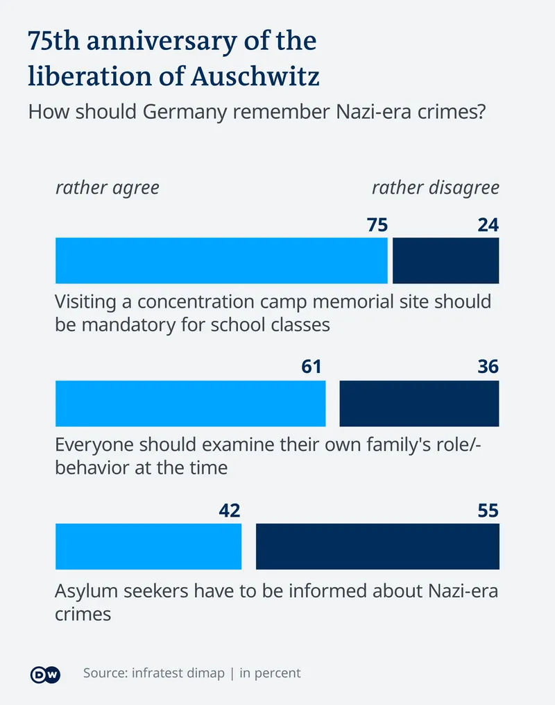 27 ianuarie marchează 75 de ani de la eliberarea lagărului de concentrare de la Auschwitz. Un sondaj de opinie realizat la cererea DW arată că germanii vor să păstreze vie amintirea ororilor comise de regimul nazist.