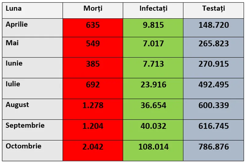 Un lucru important este că în timp ce numărul de noi îmbolnăviri a crescut de 11 ori în luna octombrie față de luna aprilie, numărul persoanelor decedate a crescut doar de 3,2 ori.