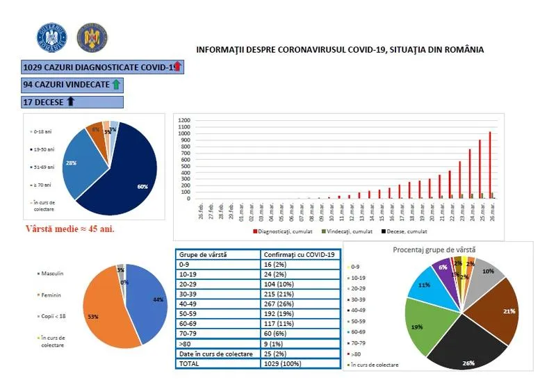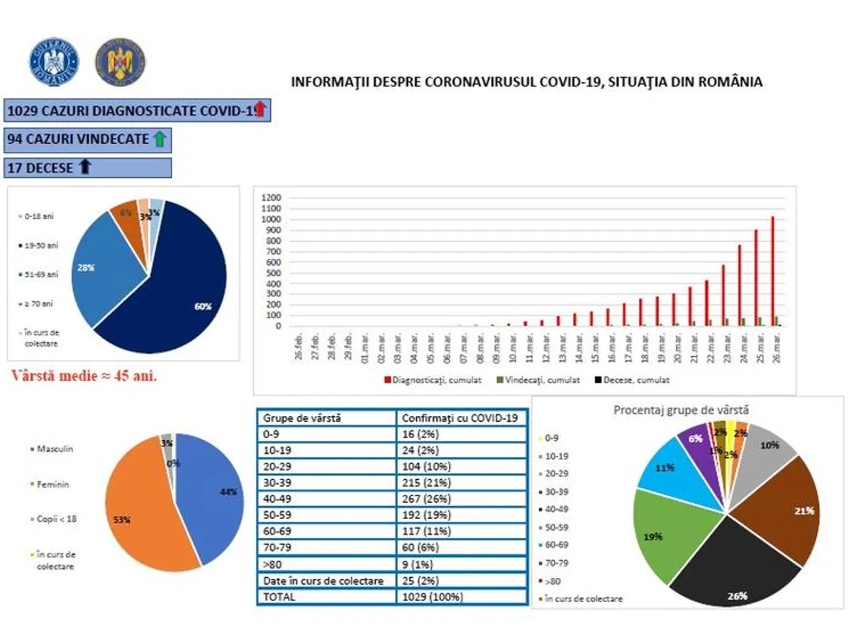 Vârsta medie a celor 1.029 de pacienți diagnosticați cu coronavirus în România până joi este de 45 de ani, arată datele transmise de Grupul de Comunicare Strategică. Cele 1.029 de cazuri confirmate de coronavirus, pe grupe de vârstă: 0-9 ani - 16 (2%) 10-19 ani - 24 (2%) 20-29