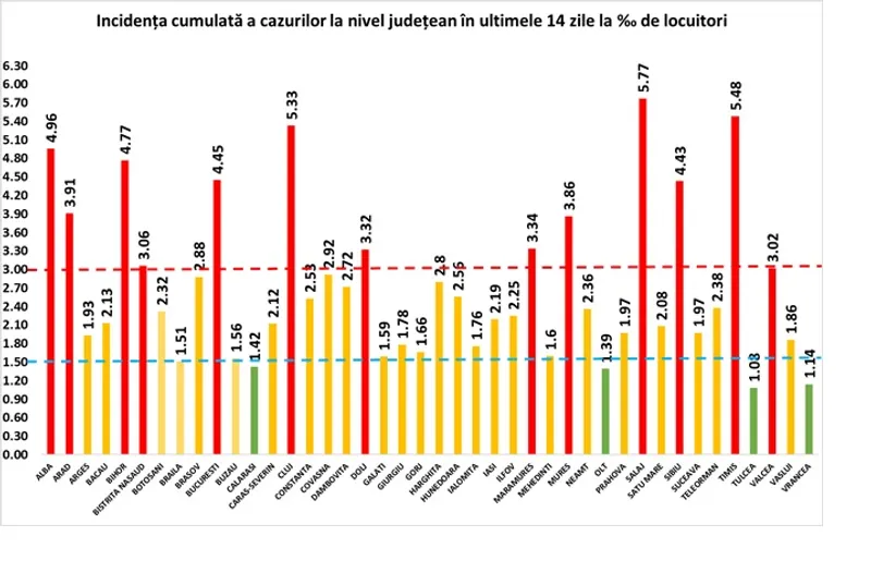 Coeficientul infectărilor cumulate la 14 zile, raportate la 1.000 de locuitori este calculat de către Direcțiile de Sănătate Publică, la nivelul Municipiului București și al județelor. Mai jos aveți graficul realizat în baza raportărilor primite de CNCCI de la Direcțiile de Sănătate Publică:
