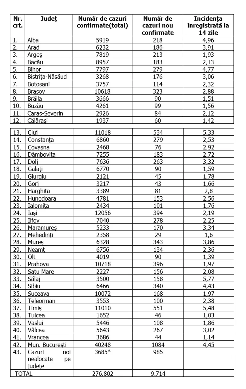 În ceea ce privește situația cazurilor noi de infectare cu coronavirus, situația arată astfel:
