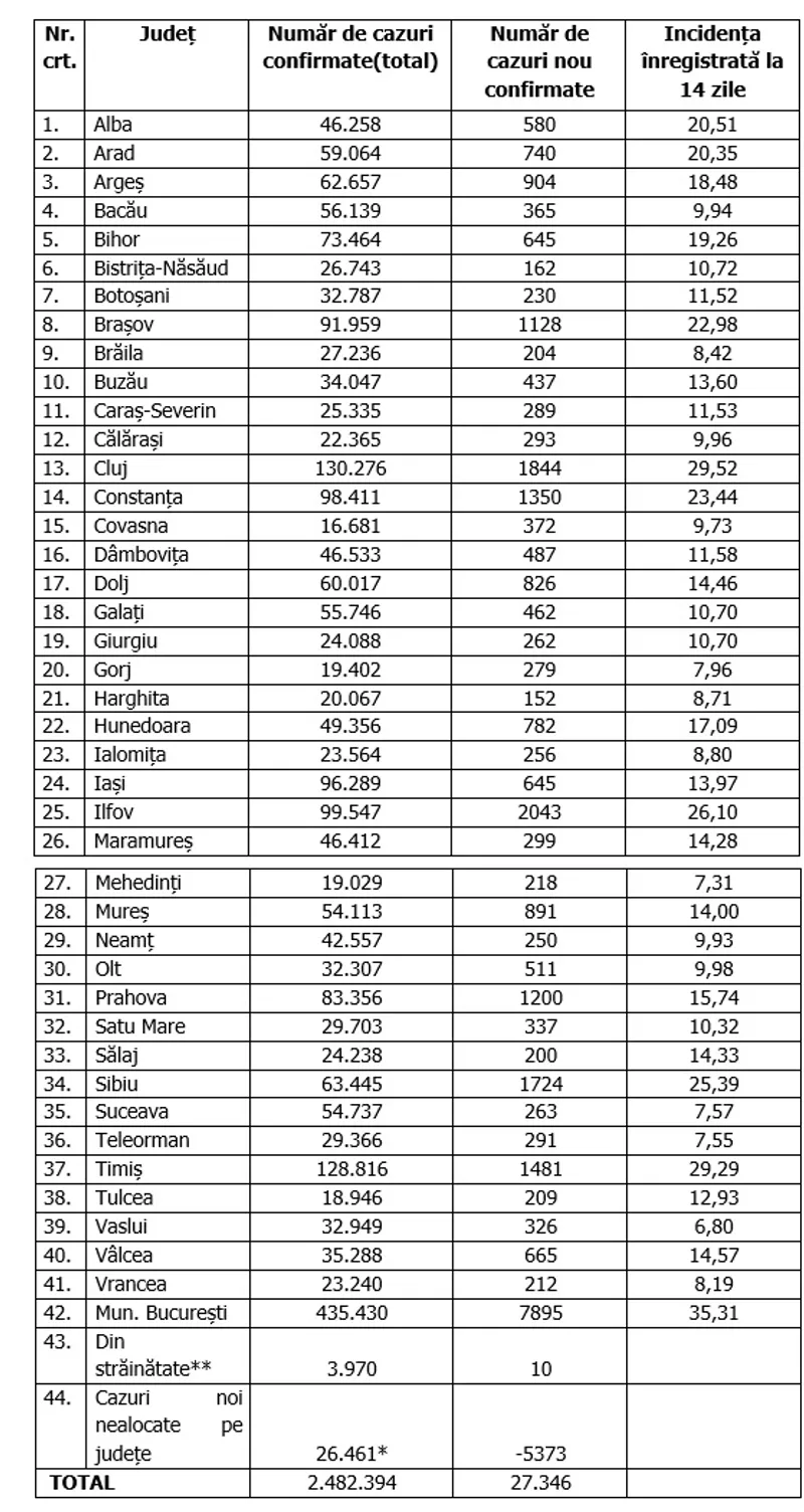 Din cele 27.346 de cazuri noi, rezultate în urma prelucrării a 94.698 de teste PCR și antigen (cifre în scădere), cele mai multe au fost confirmate în București - 7.895, lfov - 2.043, Cluj - 1.844, Timiș - 1.481, Constanța - 1.350, Prahova - 1.200, Brașov - 1.128.