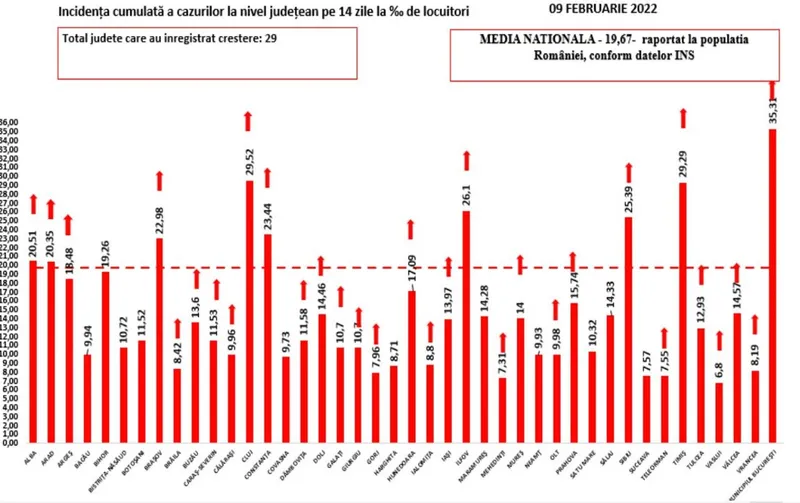 Media incidenței COVID la nivel național este de 19,67 cazuri la mia de locuitori, iar 28 de județe și Capitala raportează creșteri ale ratei de infectare, arată datele GCS de miercuri.