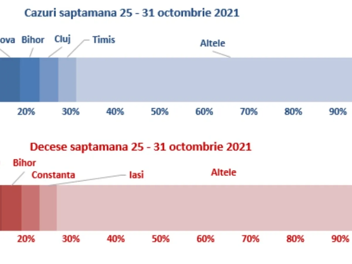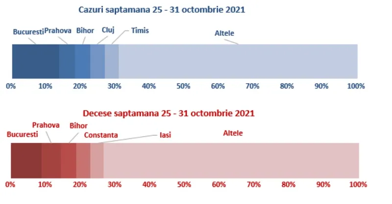 30,7 la sută din numărul nou de infectări cu COVID din ultima săptămână au fost raportate în București, Prahova, Bihor, Cluj si Timiș, iar 27 la sută din totalul deceselor au fost