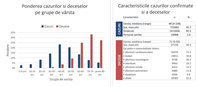În total, 85,7% din totalul deceselor au fost la persoane peste 60 ani, iar 56,5% din decese au fost la bărbați. 93,3% din persoanele decedate aveau cel puțin o comorbiditate asociată.