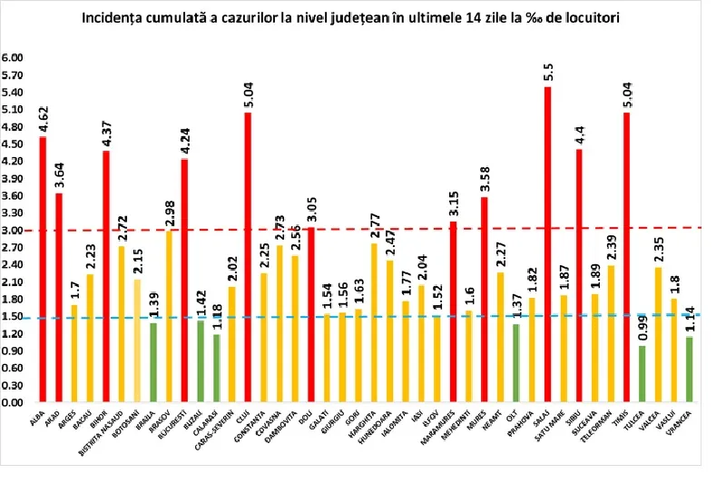 Coeficientul infectărilor cumulate la 14 zile, raportate la 1.000 de locuitori este calculat de către Direcțiile de Sănătate Publică, la nivelul Municipiului București și al județelor. Mai jos, graficul realizat în baza raportărilor primite de CNCCI de la Direcțiile de Sănătate Publică, conform Grupului de Comunicare Strategică: