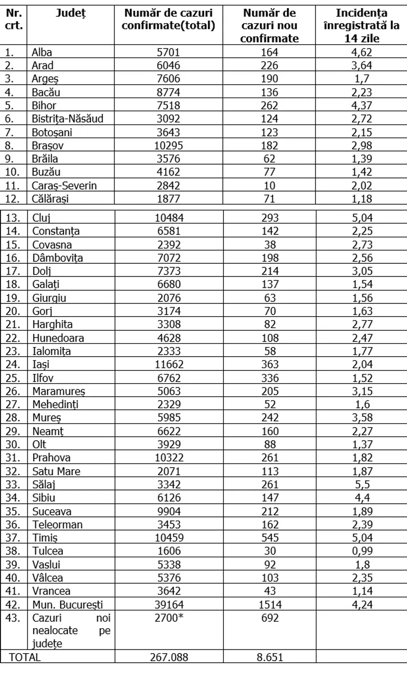 Situația cazurilor noi pe județe, în ultimele 24 de ore, se prezintă astfel: