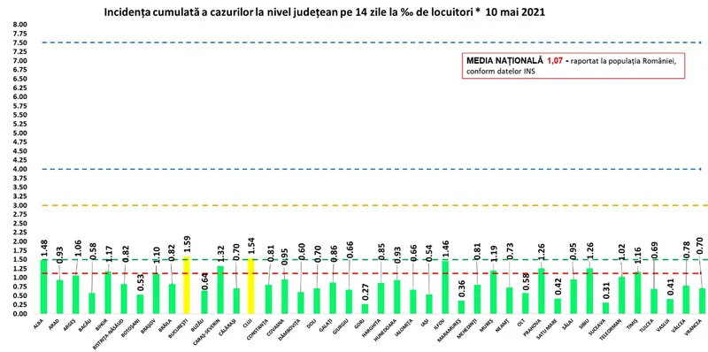 Doar Capitala și județul Cluj mai sunt în scenariul galben, cu incidențe apropiate de intrarea în scenariul verde, arată datele publicate luni de GCS. Astfel, Capitala are încă cea mai mare incidență din țară, de 1,59 la mia de locuitori iar Clujul are o incidență de 1,54 la mie.