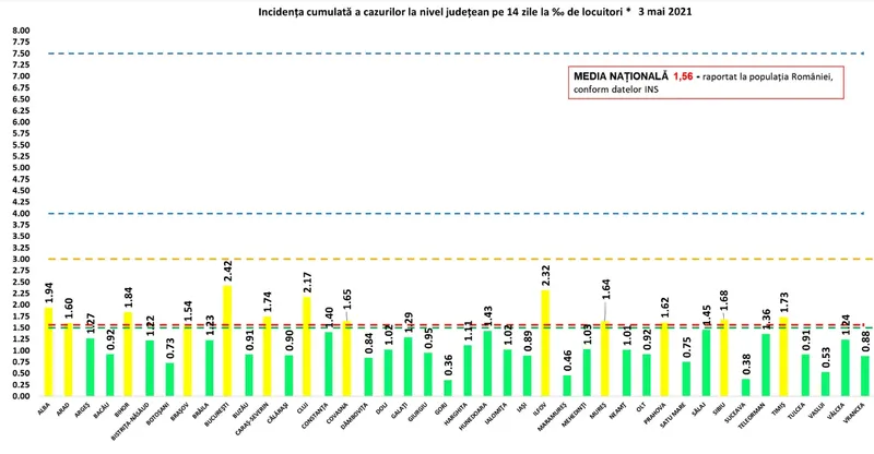 În zona roșie (incidență de peste 3 cazuri la mia de locuitori) nu mai este nici un județ, iar 12 județe și Capitala sunt în zona galbenă, cu mai mult de 1,5 cazuri la mia de locuitori, restul județelor fiind în zona verde.