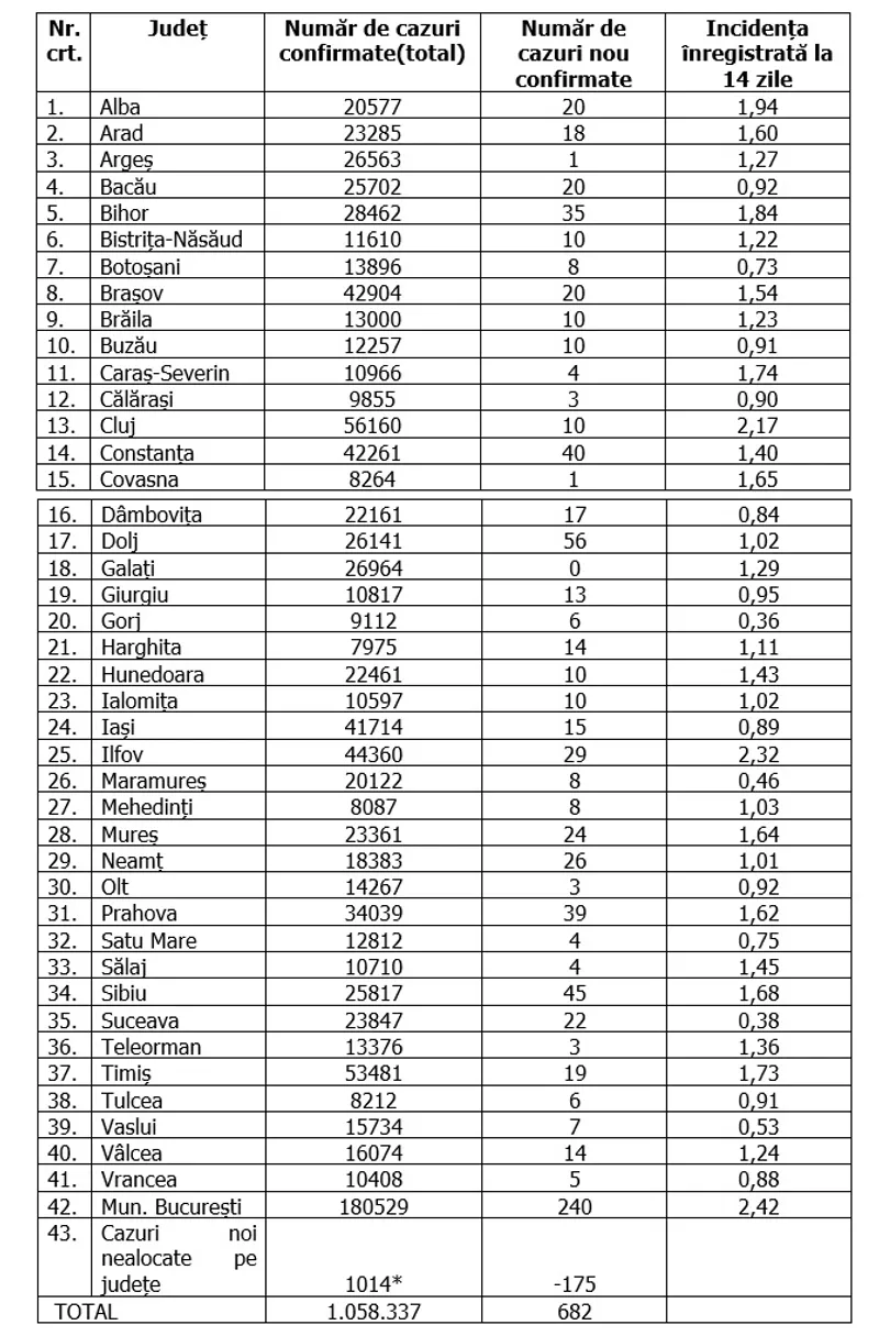 În ultimele 24 de ore, au fost confirmate doar 682 de cazuri noi, din circa 5.100 de teste. Cele mai multe cazuri noi au fost confirmate în București - 240, Sibiu - 45, Constanța - 40, Prahova - 39, Bihor - 35.