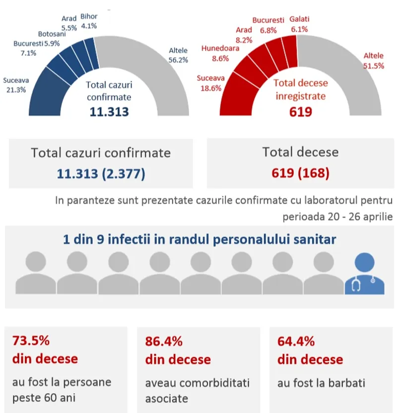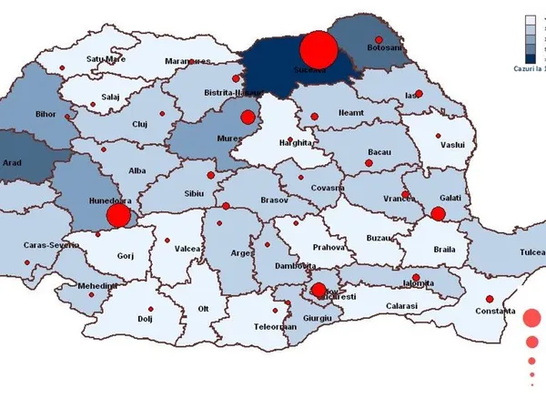 - Sunt cinci județe în care s-au înregistrat aproape jumătate din numărul total de cazuri de infectare din România: Suceava, București, Botoșani, Arad și Bihor - 43.8% din cazuri.