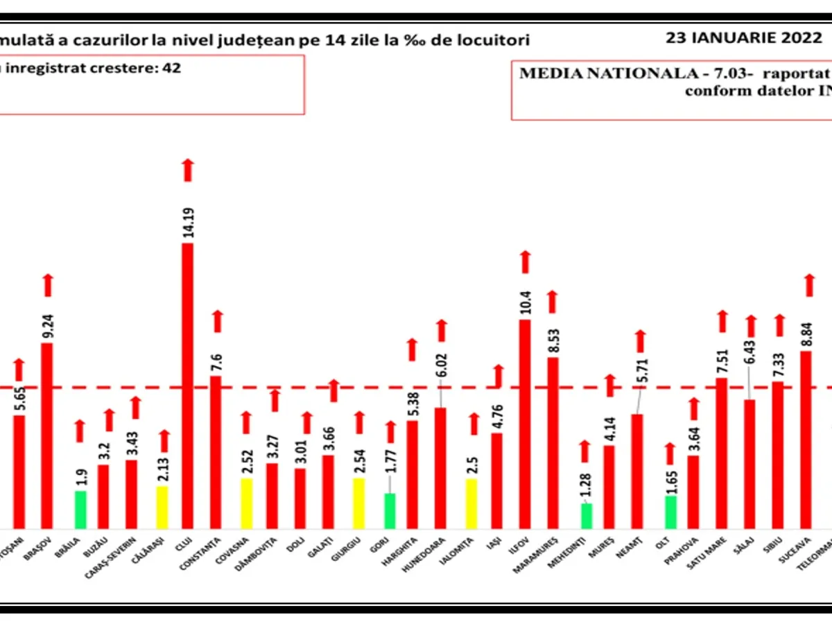 Doar 11 județe mai sunt în scenariul verde sau galben, cu mai puțin de 3 cazuri de COVID la mia de locuitori. În Cluj, unde este cea mai mare incidență din țară, rata infectărilor a ajuns la 14,19 la mie, arată datele GCS.