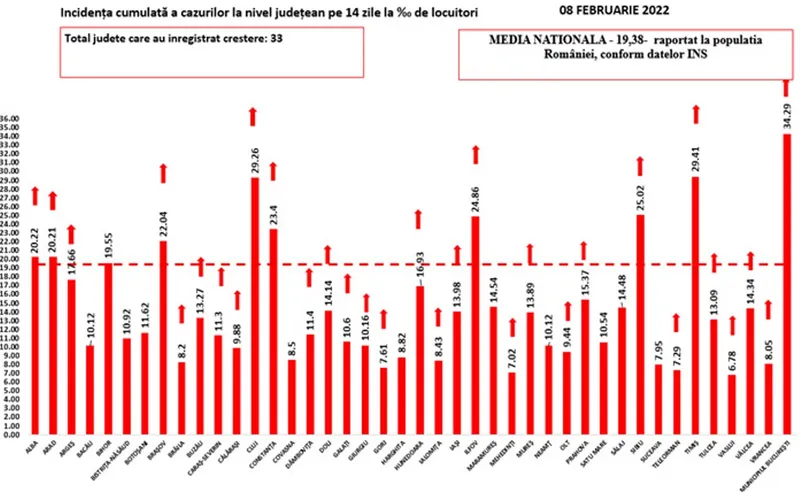 În București, rata de infectare cu coronavirus, raportată pentru ultimele 14 zile, se ridică la 34,29 la mie, iar în Timiș - 29,41 la mie și Cluj - la 29,26 la mie.