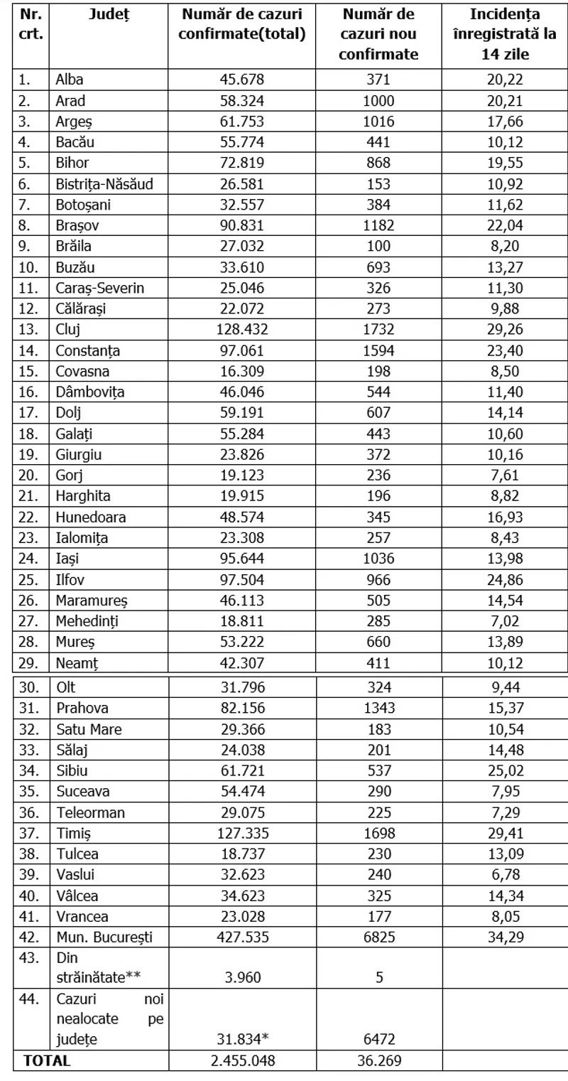 Din cele 36.262 de cazuri noi de COVID, 6.825 au fost raportate în București. Un număr ridicat de infectări raportează și:Cluj - 1.732, Timiș - 1.698, Constanța - 1.594, Prahova - 1.343, Brașov - 1.182, Iași - 1.036, Argeș - 1.016, Arad - 1.000.