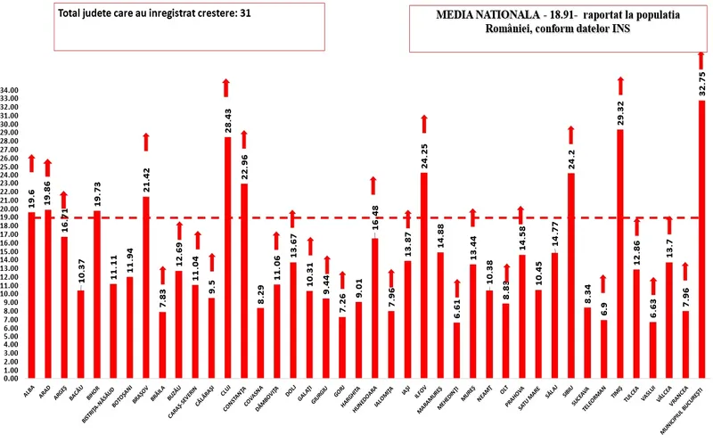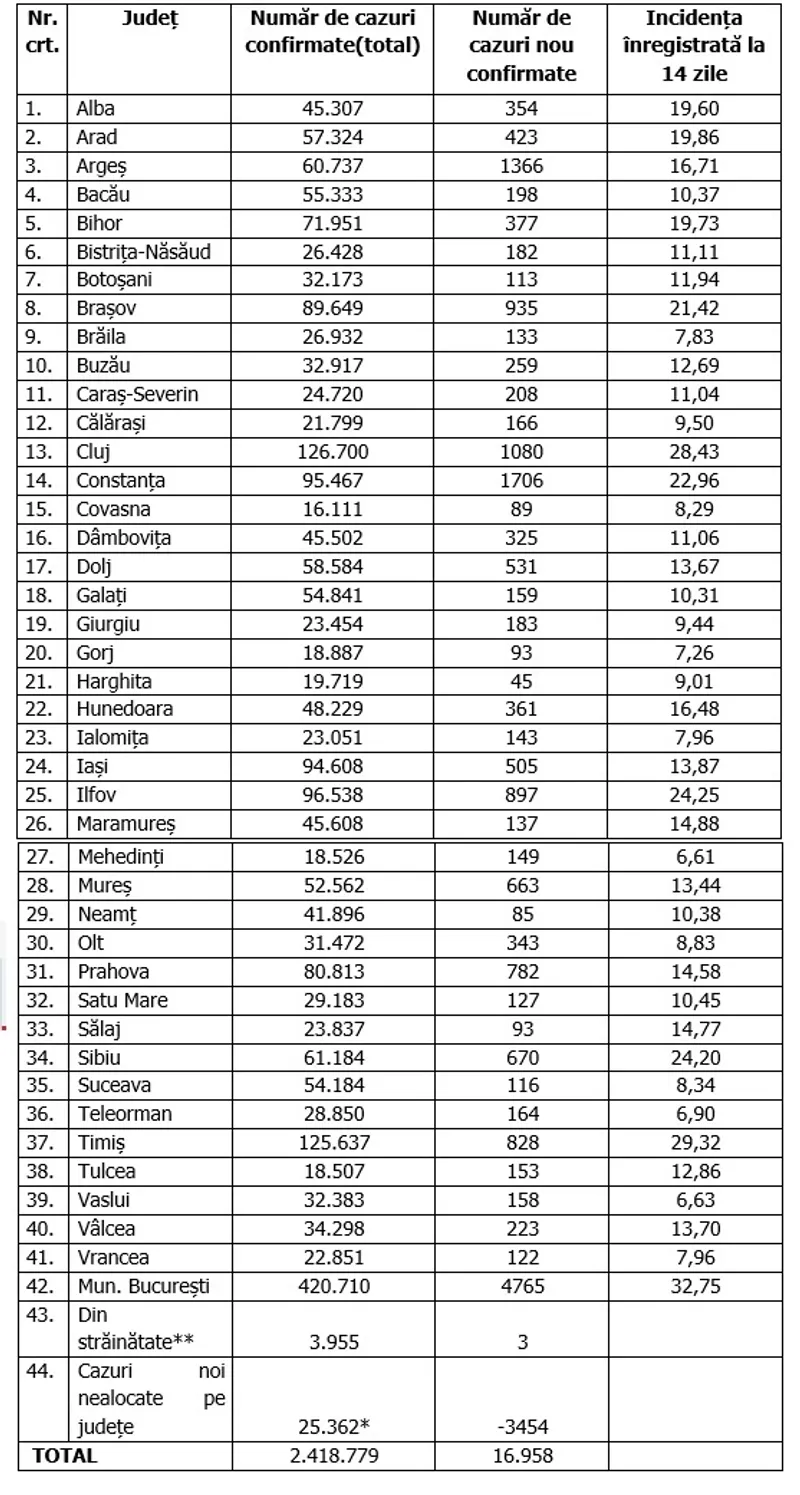 Cea mai mare rată de infectare este în București - 32,75 cazuri la mia de locuitori, iar șase județe au o incidență de peste 20 la mie. Acestea sunt: Timiș - 29,32 la mie, Cluj - 28,43 la mie, Ilfov - 24,25 la mie, Sibiu - 24,2 la mie, Constanța - 22,96 la mie, Brașov - 21,42 la mie.