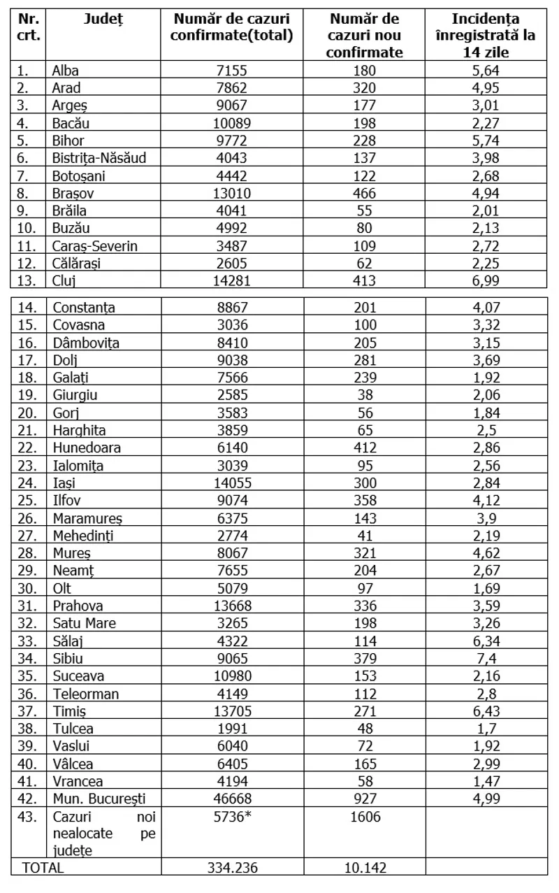 Situația cazurilor noi de infectare cu coronavirus, depistate în ultimele 24 de ore, pe județe, arată astfel: