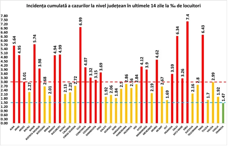 Coeficientul infectărilor cumulate la 14 zile, raportate la 1.000 de locuitori este calculat de către Direcțiile de Sănătate Publică, la nivelul Municipiului București și al județelor. Mai jos, puteți vedea graficul realizat în baza raportărilor primite de CNCCI de la Direcțiile de Sănătate Publică, conform Grupului de Comunicare Strategică.