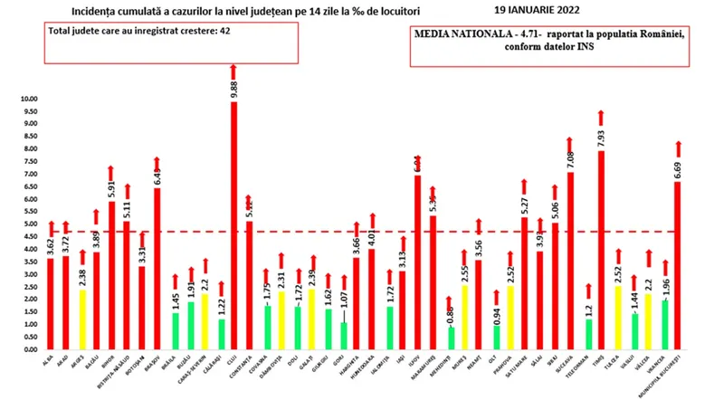 20 de județe și Capitala sunt în scenariul roșu, cu incidențe de peste 3 la mie, iar rata de infectare la nivel național a ajuns la 4,71 cazuri la mia de locuitori, conform GCS.