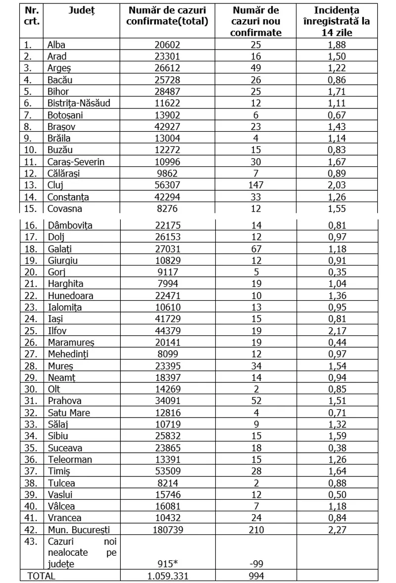 În ultimele 24 de ore, au fost confirmate 994 de cazuri noi de infectare cu coronavirus, din circa 14.000 de teste PCR și rapide prelucrate. Cele mai multe cazuri noi au fost confirmate în: București - 210, Cluj - 147, Galați - 67.