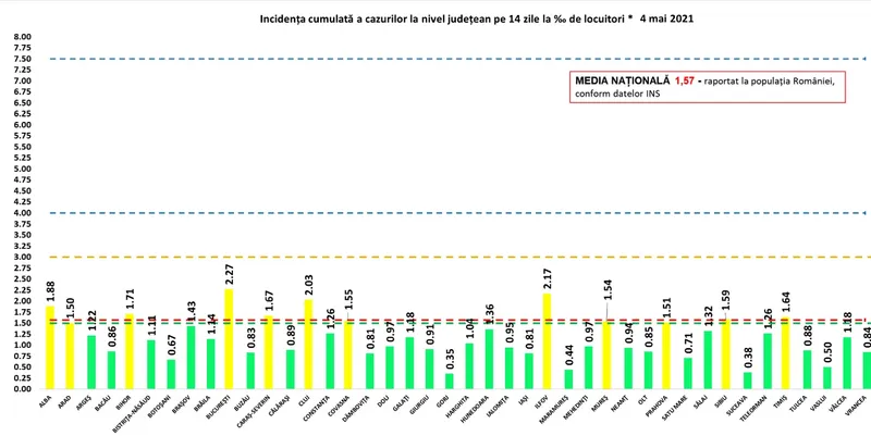 În scenariul verde sunt 30 de județe, cele mai mici rate de infectare cu COVID fiind în Gorj - 0,35 la mie și Suceava - 0,38 la mie.