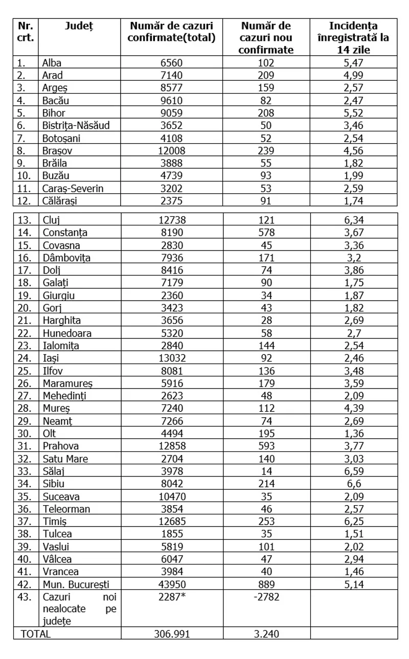 În ceea ce privește situația cazurilor noi pe județe, topul arată astfel: