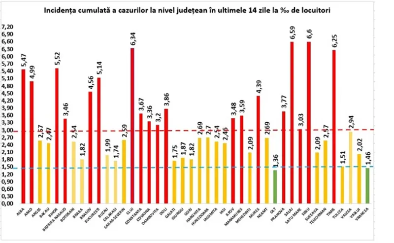 18 județe și Capitala raportează creșteri de peste 3 infectări la mia de locuitori, patru județe sărind de pragul de 6 cazuri/1.000. În Capitală, incidența a trecut de 5 la mie, deși sunt în vigoare restricții de trei săptămâni.