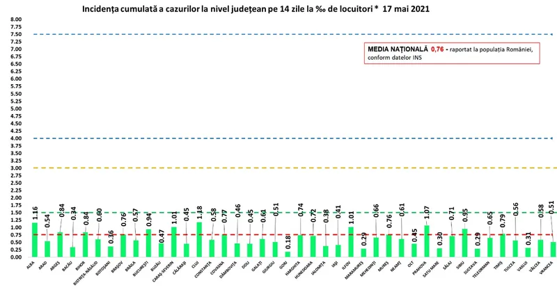 Incidența se menține în toată țara sub 1,5 cazuri la mia de locuitori. Cele mai mari rate de infectare, de peste 1 la mie, sunt în: Ilfov și Caraș-Severin - 1,01 la mie, Alba - 1,16 la mie, Cluj - 1,18 la mie.