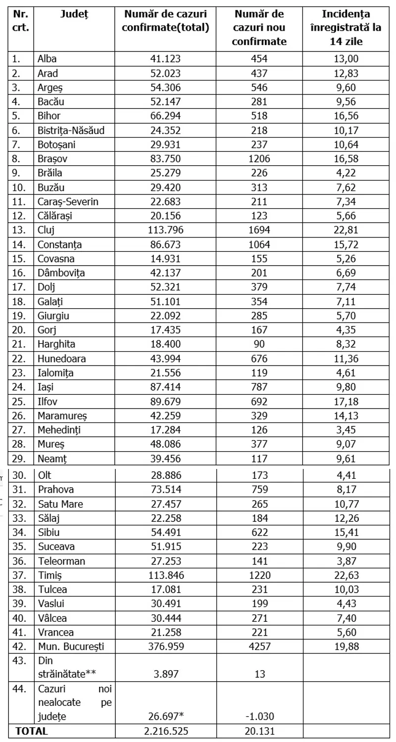 Din cele 20.131 de cazuri noi, cele mai multe au fost confirmate în București - 4.257, Timiș - 1.220, Brașov - 1.206, Cluj - 1.694, Constanța - 1.064.