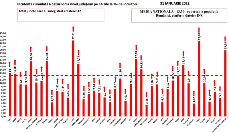Județele cu cele mai mari rate de infectare sunt: Cluj - 22,81 la mie, Timiș - 22,63 la mie, București - 19,88 la mie, Constanța - 15,72 la mie, Ilfov - 17,18 la mie.