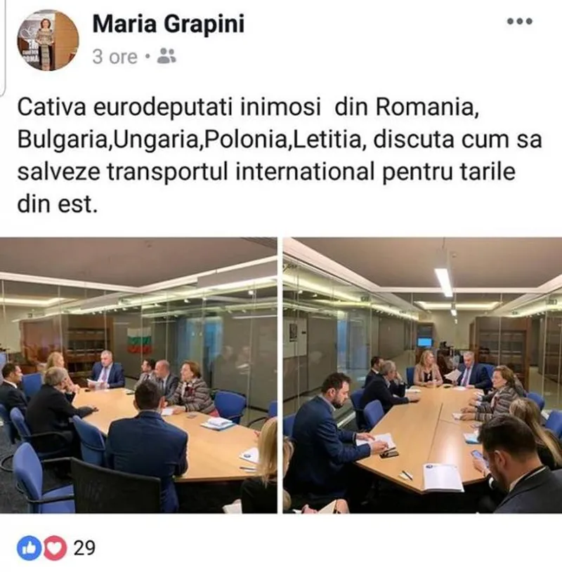Europarlamentara a scris marți pe Facebook: „Câțiva eurodeputați inimoși din România, Bulgaria, Ungaria, Polonia, Letiția, discută cum să salveze transportul internațional pentru țările din est”.