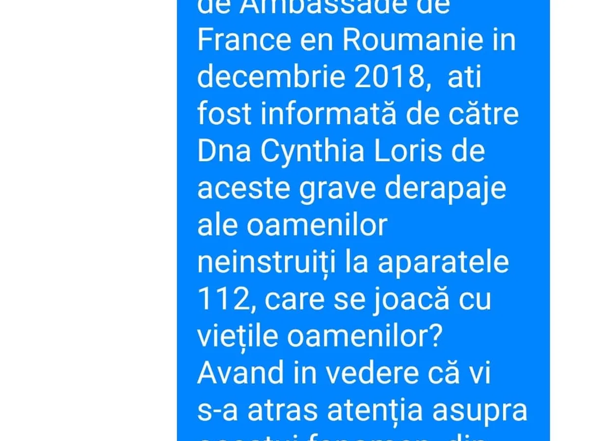 La o dezbatere organizată de Ambasada Franței în România, în 2018, Cynthia Loris, o artistă din Sibiu care a fost victima agresiunilor concubinului, a informat-o pe șefa Agenţiei Naţionale pentru Egalitatea de Șanse între Femei şi Bărbaţi (ANES), Graţiela Drăghici, despre oamenii neinstruiți de la Serviciul 112.