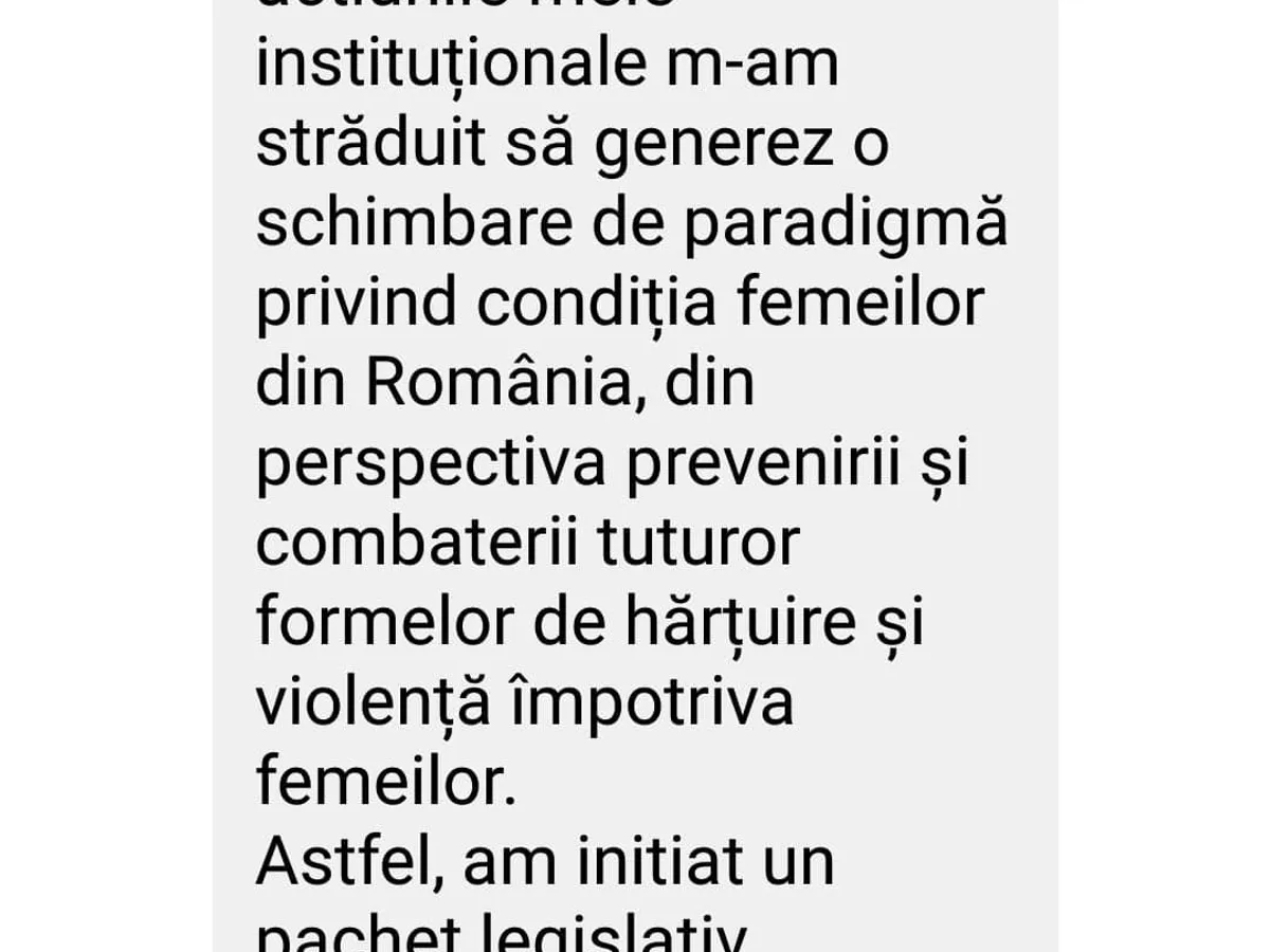 „M-am străduit să generez o schimbare de paradigmă privind condiția femeilor din România. Astfel, am inițiat un pachet legislativ, dezbătut cu toți factorii relevanți din domeniu, am inițiat două proiecte cu fonduri externe, europene și norvegiene ce vizează dezvoltarea a noi tipuri de servicii sociale”, a scris Grațiela Drăghici în răspunsul oferit tinerei.