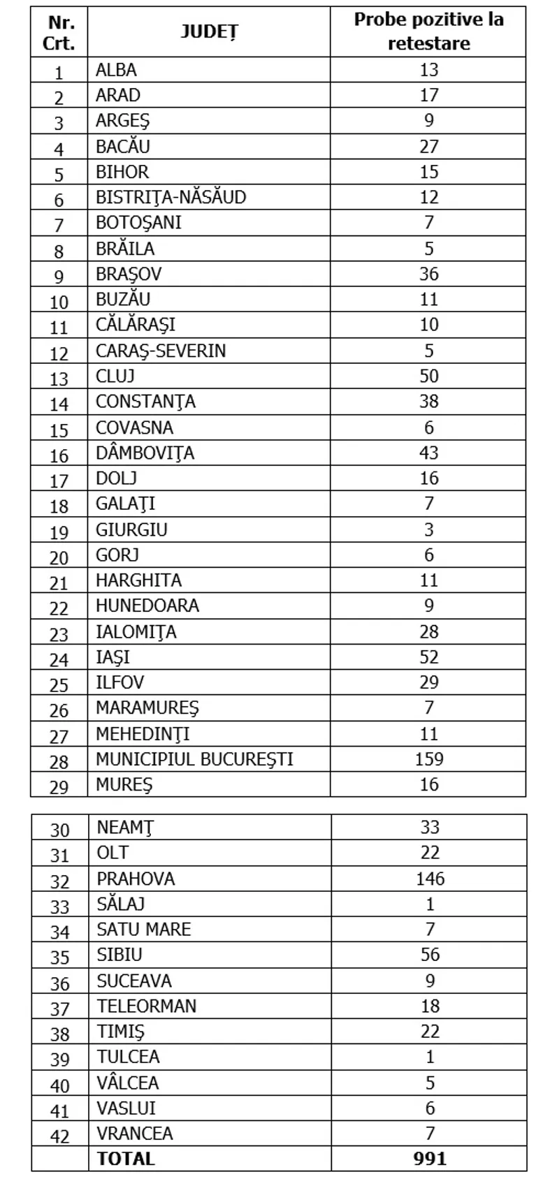 Distinct de cazurile nou confirmate, în urma retestării pacienților care erau deja pozitivi, 991 de persoane au fost reconfirmate pozitiv.