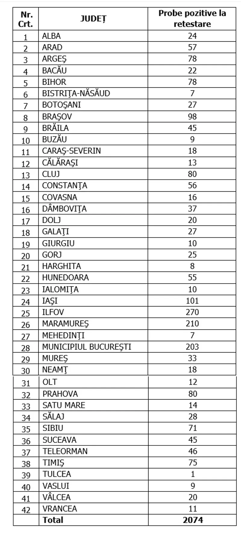 Distinct de cazurile nou confirmate, în urma retestării pacienților care erau deja pozitivi, 2.074 de persoane au fost reconfirmate pozitiv.