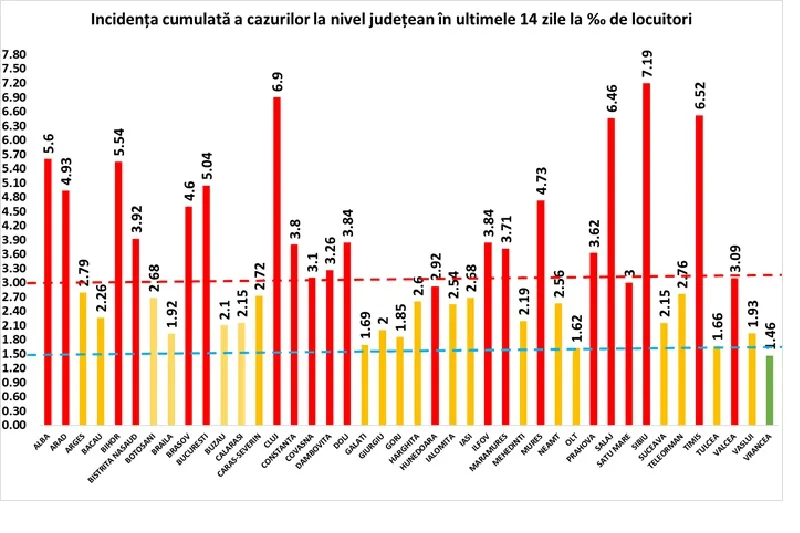 Coeficientul infectărilor cumulate la 14 zile, raportate la 1.000 de locuitori este calculat de către Direcțiile de Sănătate Publică, la nivelul Municipiului București și al județelor. Mai jos aveți graficul realizat în baza raportărilor primite de CNCCI de la Direcțiile de Sănătate Publică: