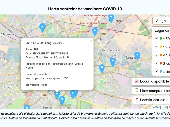 Harta cuprinde toate centrele de vaccinare active în platformă, tipul vaccinului administrat în acestea, numărul locurilor disponibile și numărul persoanelor înscrise