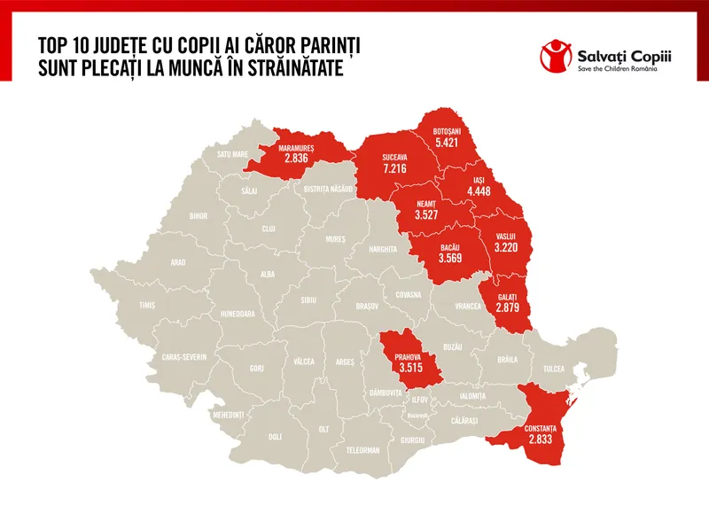 75.800 de copii au cel puțin un părinte la muncă în străinătate. Pe primul loc este județul Suceava: în iunie 2021, 7.216 copii din Suceava aveau unul sau ambii părinți plecați la muncă în străinătate.