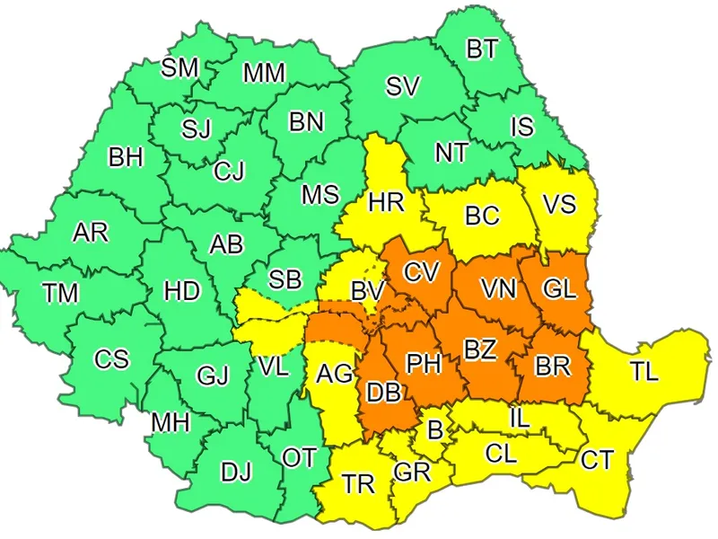 Sub cod portocaliu de instabilitate termică se află județele Covasna, Harghita, Brașov, precum și în zona de munte a județelor Bacău, Vrancea, Buzău, Prahova, Dâmbovița și Argeș, duminică, până la ora 18.00.