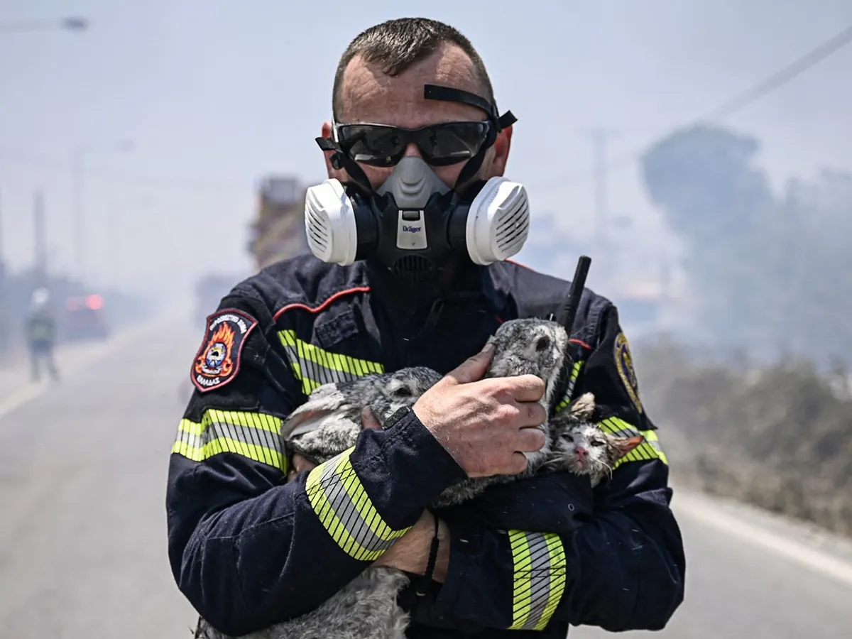 52 de pompieri români au ajuns în această dimineață în Rodos și intervin pentru stingerea mai multor incendii care se manifestă în sud-estul insulei, însă de departe fotografia zilei care a făcut înconjurul internetului vine de la un salvator român.