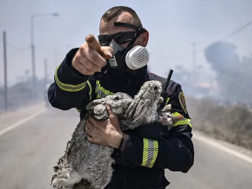 Nu numai oamenii suferă din cauza incendiilor de vegetație, dar și animalele care s-au trezit acum fără „casa lor” - pădurea. Unul dintre pompierii români aflați la intervenție a reușit să salveze din calea flăcărilor doi iepurași speriați.