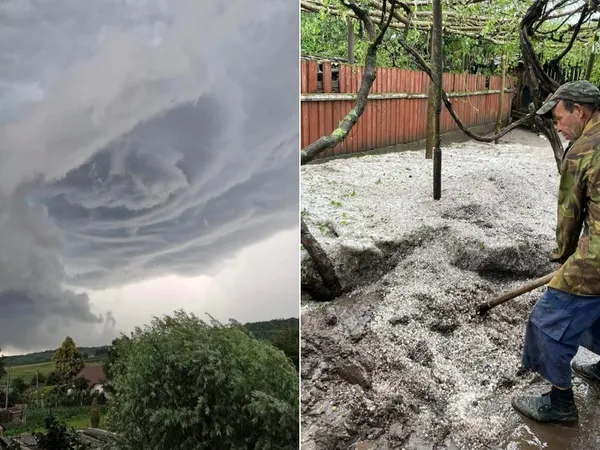 Localnicii au publicat mai multe fotografii pe rețelele sociale cu nori ciudați. Grindina a fost luată cu lopata din curți.