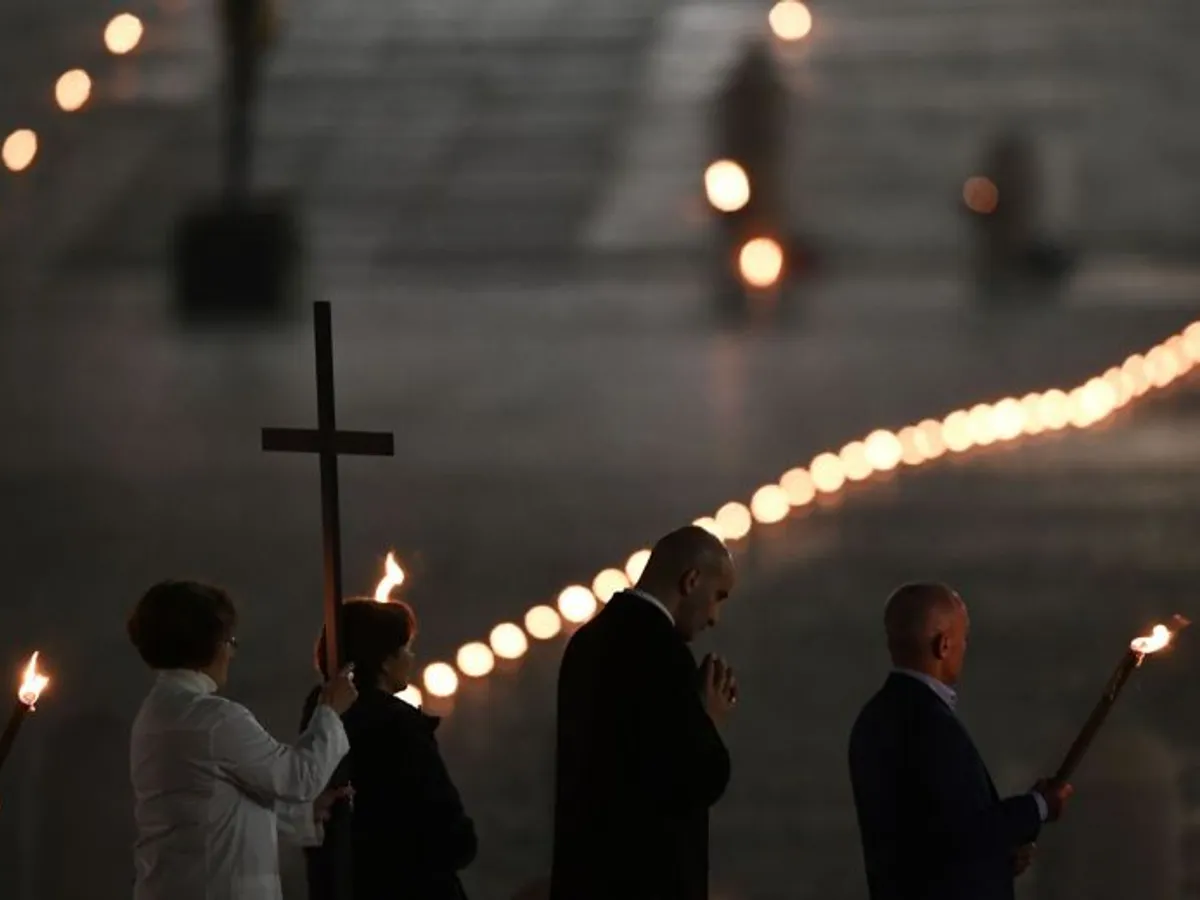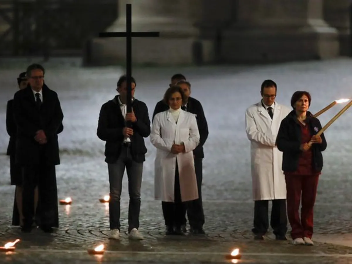 Papa Francisc, în vârstă de 83 de ani, a urmărit procesiunea de pe un podium acoperit din afara bazilicii, unde erau aprinse lumânări. În noaptea blândă şi caldă, doar pescăruşii ce zburau deasupra pieţei se puteau auzi.